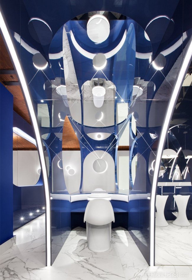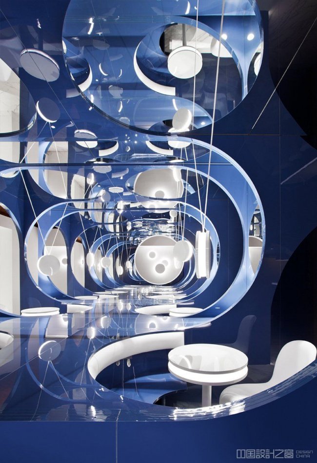 在这座蓝色雕塑中,游客沉浸在充满活力的拱门和圆形景观中,这些景观向四面八方反射。能够创造物质现实的反光景观,仿佛艺术是一个纯粹的直接和互动的实验。每个全景模块的设计都有一个狭窄的水平排列,中间有一个中间动脉,有两个相对的长凳,两个相对的同时亲密的空间,同时扩展和满足。材料是这场建筑表演无可争议的主角,它被展示、瞥见、触摸并与空气混合,这似乎是空间的每一面墙上的切割。